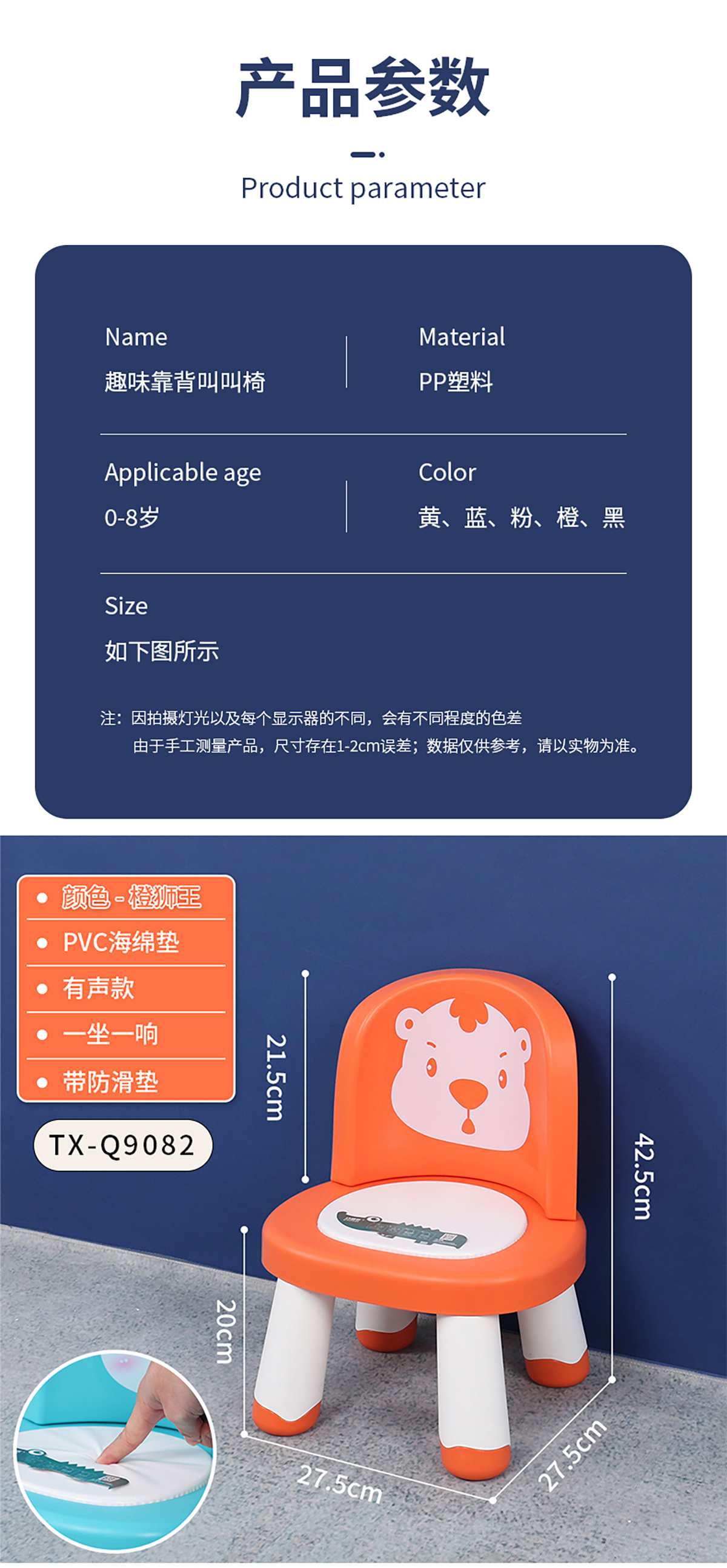 Size: TX-Q9082(有聲):長320*寬290*高420椅面高200mm TX-Q9084(無聲):長320*寬290*高420椅面高200mm