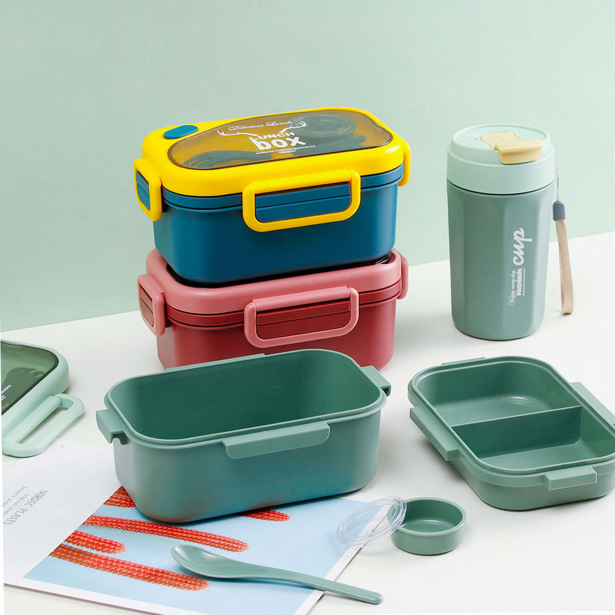 品悅長方雙層密封飯盒(1100ml)(含醬料盒)+圓形/八角隨行杯(500ml)